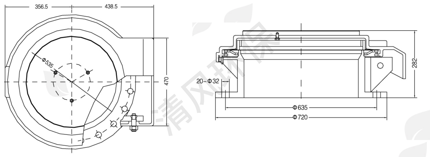 本設備應用于庫頂,在庫內(nèi)壓力超過正常范圍時即自動打開,進行泄壓,作為壓力保護作用。