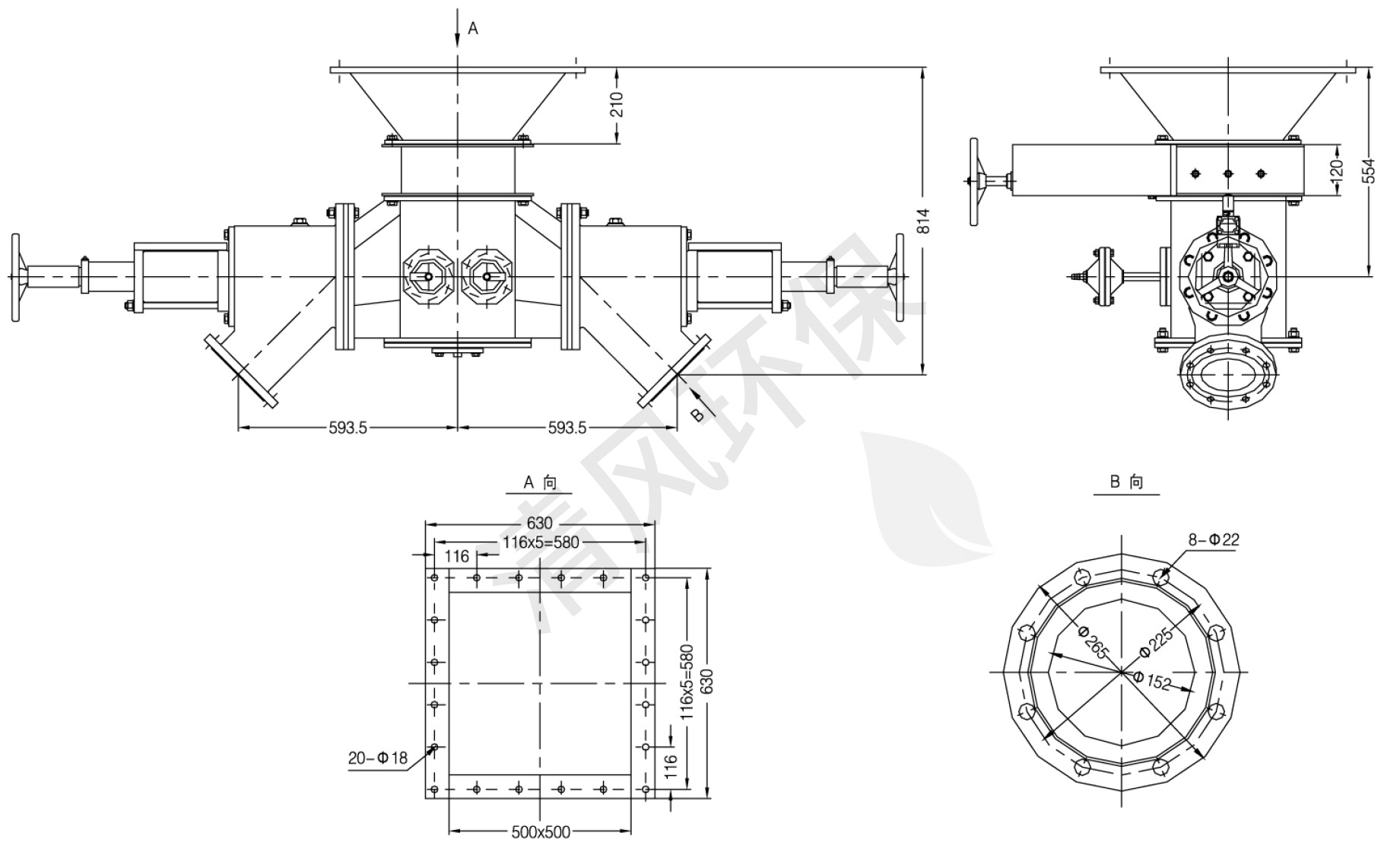 庫底卸料器用于物料貯倉側(cè)面或底部,設(shè)備帶有流化裝置,卸料時能使物料流態(tài)化排出,通過輸送管道,配合散裝機,攪拌機直接裝料。該設(shè)備有氣動和手動兩種控制方式,氣動用電磁閥控制氣缸伸縮運動,實現(xiàn)卸料閥門的啟閉;手動為轉(zhuǎn)動手輪啟閉閥門。