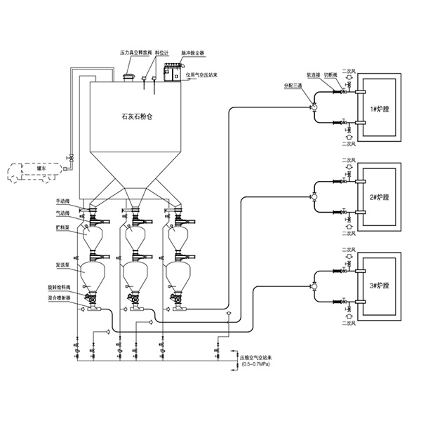 壓縮空氣作動(dòng)力氣源,實(shí)現(xiàn)連續(xù)輸送。用于火電廠鍋爐燃料摻加石灰石粉(脫硫劑)的輸送,石灰石粉輸送系統(tǒng)的程序采用自動(dòng)控制程序,并有與DCS的通訊接口。石灰石粉輸送系統(tǒng)正常工作在自動(dòng)方式下運(yùn)行,程序按順序自動(dòng)打開(kāi)或關(guān)閉各種閥門。石灰石粉輸送量的大小接受上部DCS系統(tǒng)控制,根據(jù)鍋爐煙氣含硫量檢測(cè)信號(hào),通過(guò)DCS程序調(diào)整石灰石粉噴射量,達(dá)到理想的脫硫效果。