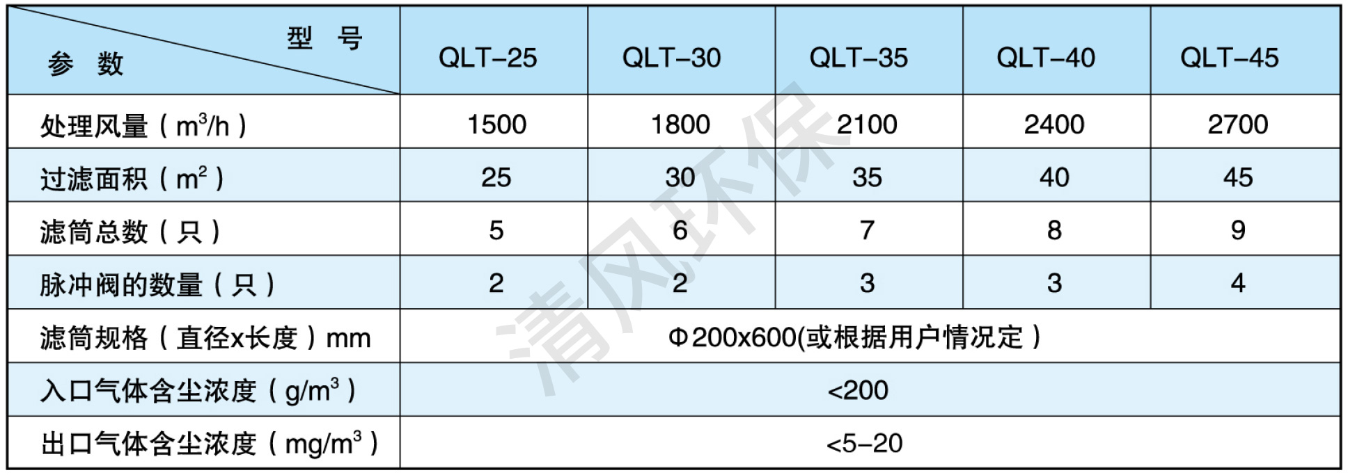 QLT-A型串聯(lián)布置脈沖除塵器性能參數(shù)表