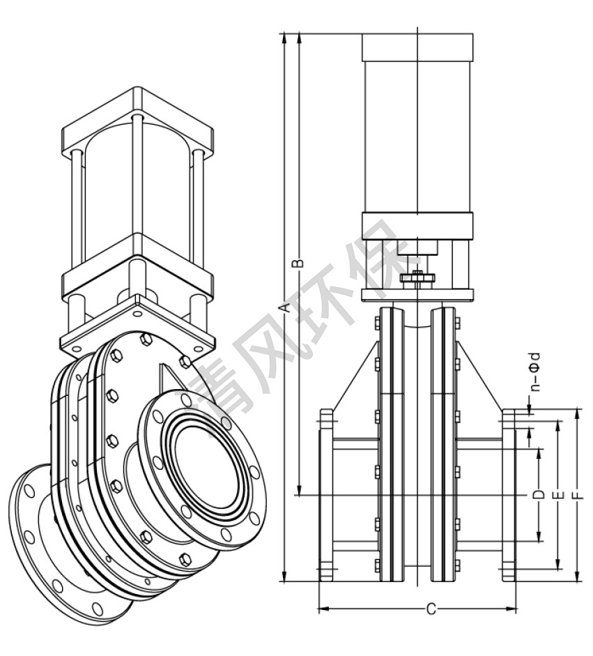 氣動出料閥設置于倉泵物料出口,倉泵輸送時,該閥門打開,倉泵輸送結束時,該閥門關閉。工作時,氣缸通過活塞桿帶動閥芯做往復運動打開或關閉閥門。
